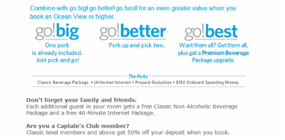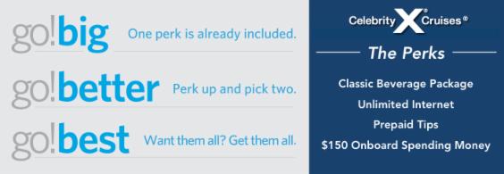 Oceanview Cabins - $1602 per personThe above cabins are part of Celebrity's Go BIG promo.Choose 1 perk, included in the price of your cruise. Choose 2 perks (add $15 per person / day) *BEST VALUEChoose All 4 Perks (add $45 per person / day)![]() *Perks are PER PERSON (so $150 per person onboard credit; ie $300 per cabin) BEST VALUE: Choose 2 perks for $15 pp/day (choose Beverage Package and Onboard Credit; Pay $105 for $150, then you can pay your TIPs and have $45 left over!) Inside Cabin - $1162 per person (does not include perks)Single Rates: - Inside Cabin: $2121 Oceanview: $3001 Balcony: $3501*Cruiseline reserves the right to impose a fuel supplement on all guests if the price of West Texas Intermediate fuel exceeds $65.00 per barrel. The fuel supplement for 1st and 2nd guests would be no more than $10 per guest per day, to a maximum of $140 per cruise; and for additional guests would be no more than $5 per person per day, to a maximum of $70 per cruise. |