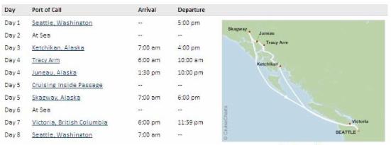Itinerary: Ketchikan, Alaska; Tracy Arm Fjord; Juneau, Alaska; Skagway, Alaska; Victoria, British Columbia.